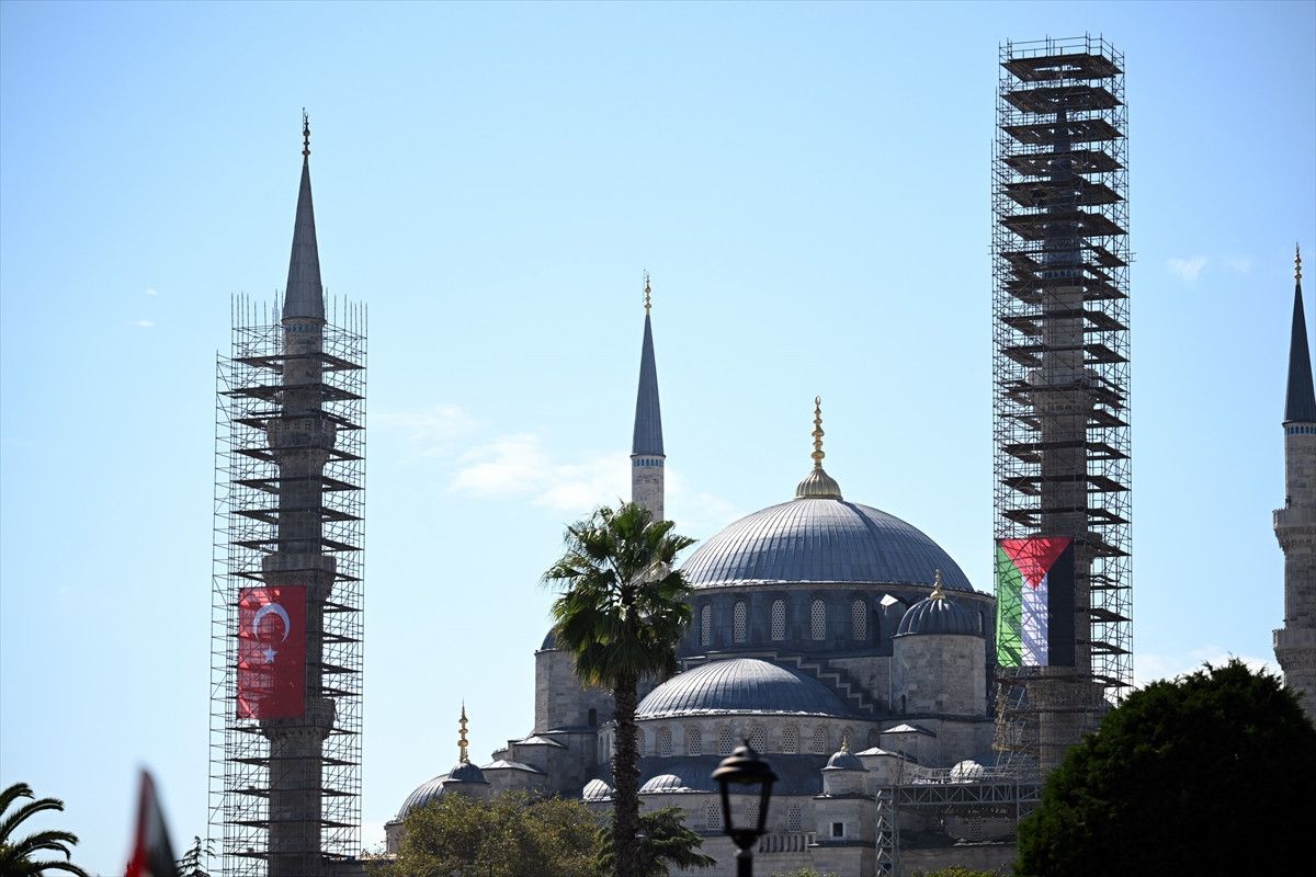 Sultanahmet Camisi’nin minarelerine asılan Türk bayrağı ve Filistin bayrağı görüntülendi.