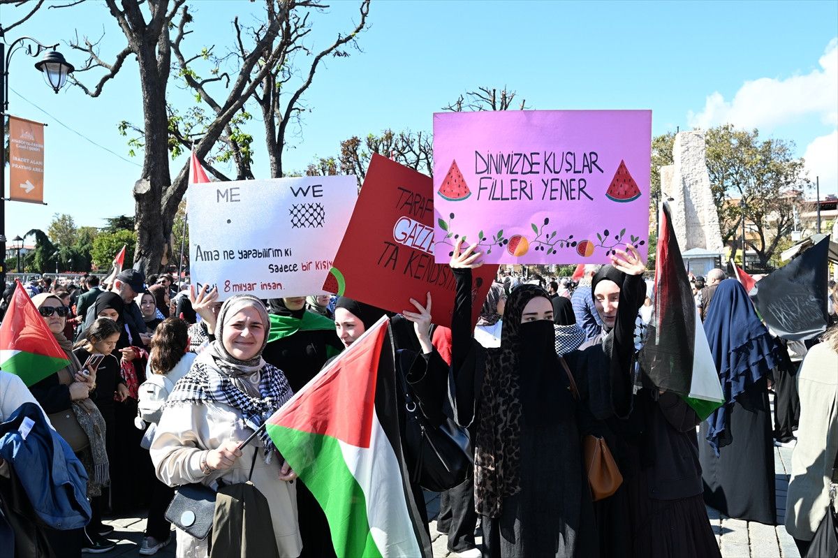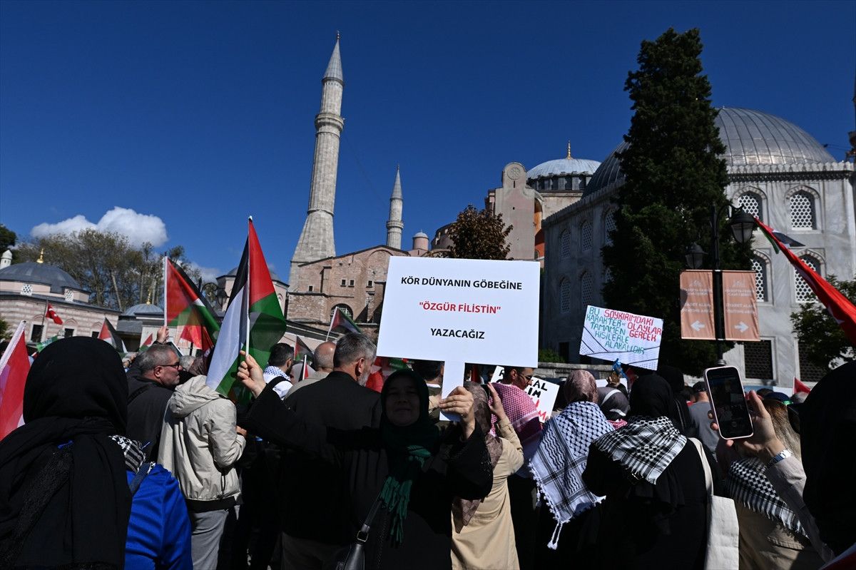 İHH İnsani Yardım Vakfı ve Filistin’e Destek Platformu, İsrail’in saldırısı altındaki Filistin ile Küresel Sumud Filosu’na destek için öğle namazının ardından Ayasofya’dan Eminönü Meydanı’na yürüyüş düzenledi.