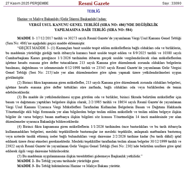 Tebliğ ile mevcut düzenlemeye Geçici Madde 3 eklendi. Buna göre, kazançları basit usulde tespit edilen ve 8 Eylül 2025 tarihli Cumhurbaşkanı Kararı uyarınca 1 Ocak 2026’dan itibaren gerçek usulde vergilendirilecek mükellefler için belge basım, dağıtım ve izleme süreçlerinde yeni bir geçiş mekanizması getirildi. Düzenlemeyle, bu kapsamdaki mükelleflerin bağlı oldukları oda ve birlikler, Vergi Usul Kanunu kapsamında tutulması gereken defter ve kullanılacak belgelerin basımı ve dağıtımı konusunda Gelir Vergisi Genel Tebliği hükümlerine göre yetkilendirildi.
