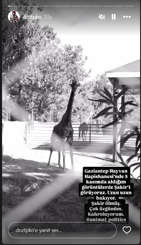 Gaziantep Hayvanat Bahçesi'nin simgesi zürafa Şakir, 32 yaşında yaşamını yitirdi. Akıllara etolog ve hayvan foto muhabiri Deniz Tapkan'ın, 5 Kasım’daki ziyaretinde zürafaların tutulduğu alanla ilgili yaptığı "Ölümcül komplikasyonlara yol açabilir" uyarısı akıllara geldi.