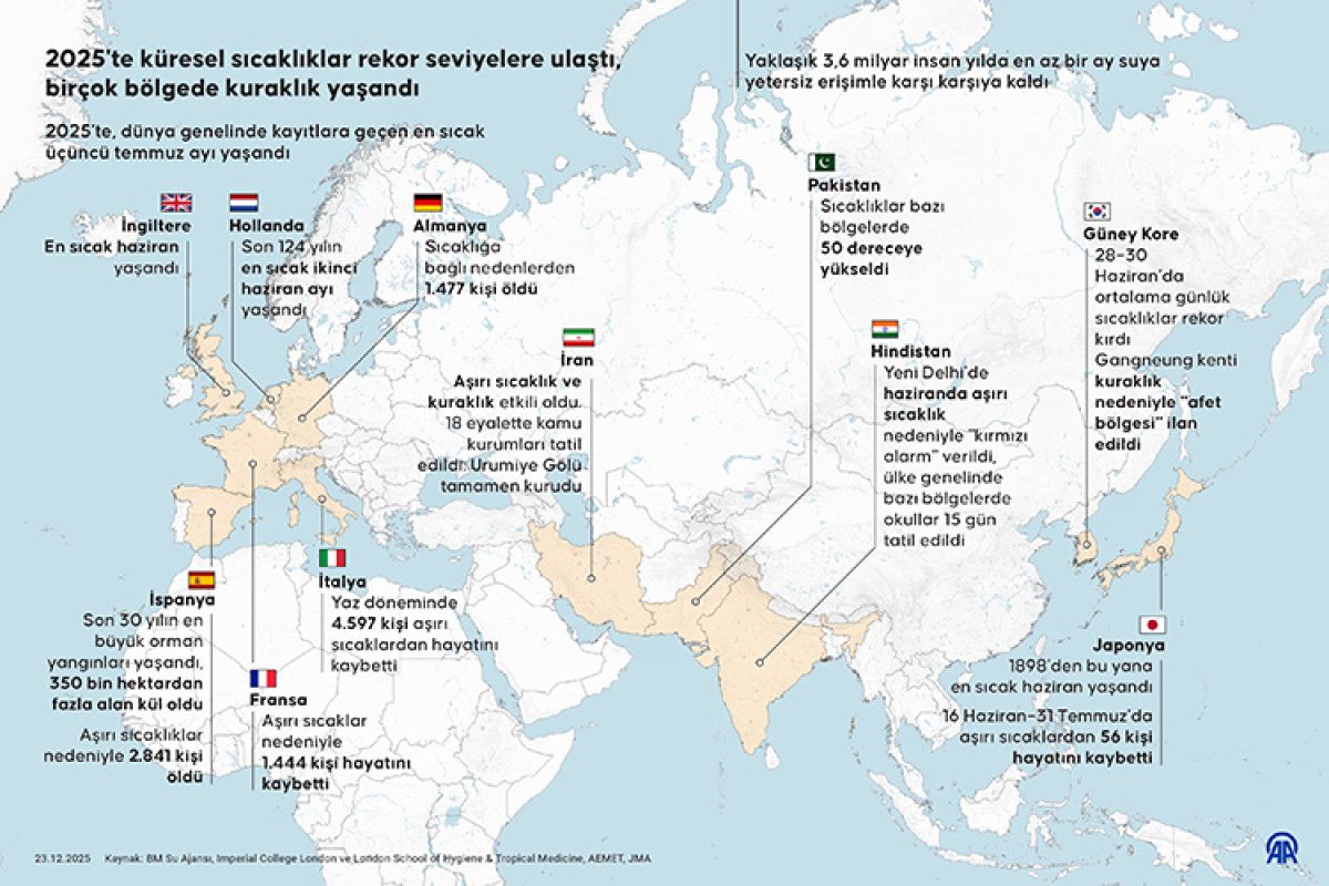 WMO, kasım ayında yayımladığı raporda 2025’in, ölçümlerin yapıldığı modern dönemde en sıcak ikinci ya da üçüncü yıl olacağını duyurdu. Raporda, olağanüstü sıcaklık eğilimlerinin yıl boyunca etkisini sürdürdüğü vurgulandı.