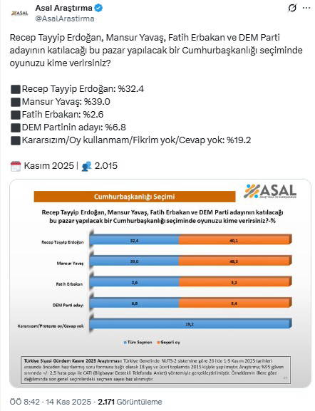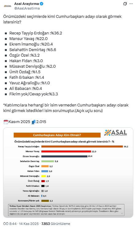 Asal Araştırma'nın anketine göre AKP'li Cumhurbaşkanı Recep Tayyip Erdoğan, 'açık uç'lu Cumhurbaşkanlığı adaylığı sorusunda ilk sırada yer buldu. Erdoğan'la Mansur Yavaş'ın da yer aldığı dört aday arasında ise seçmenin tercihi açık ara farkla Yavaş oldu.