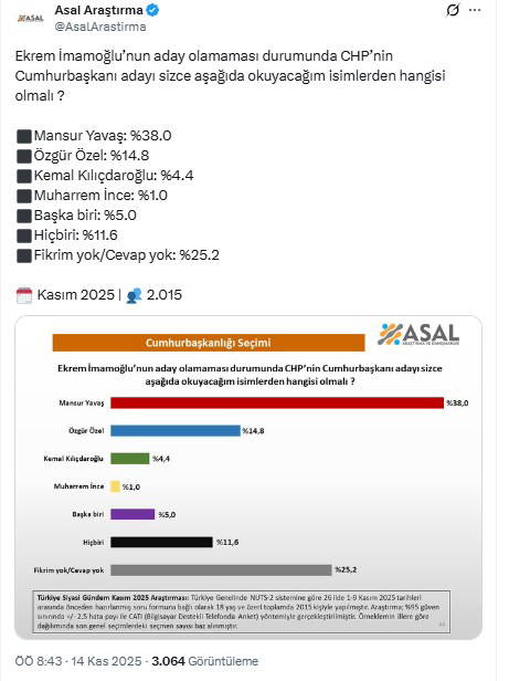 Araştırmada, Ekrem İmamoğlu’nun aday olamaması durumunda CHP’nin Cumhurbaşkanı adayının kim olması gerektiği sorusu yöneltildi. Buna göre katılımcıların en çok aday olarak görmek istediği isim yüzde 38 ile Mansur Yavaş oldu. CHP Genel Başkanı Özgür Özel ise yüzde 14.8’de kaldı.