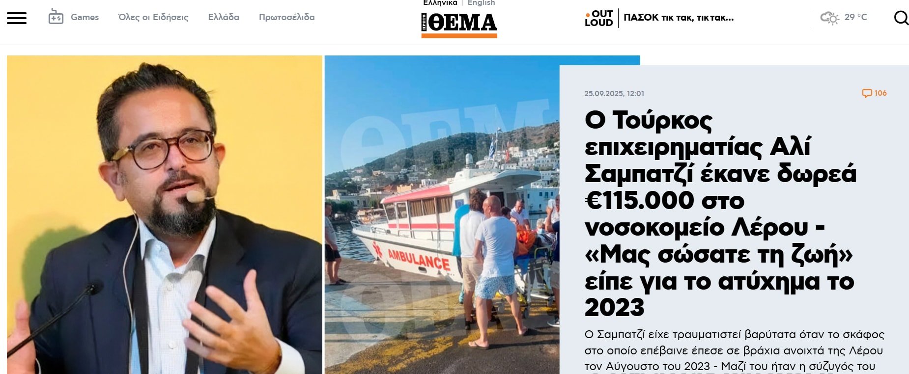 24 Ağustos 2023 tarihinde Bodrum’da tatilde iken Leros adasına eşi Vuslat Doğan Sabancı ve yatı ile ziyarete giden ve orada geçirdikleri tekne kazasında ciddi yaralanan ve ilk tedavisi Leros adasında yapılan iş insanı Ali Sabancı kazadan sonra ilk kritik müdahalelerin yapıldığı Leros Devlet Hastanesi’ne 5,6 milyon Türk Lirası (yaklaşık 115.000 Euro) bağışta bulunduğu ortaya çıktı.